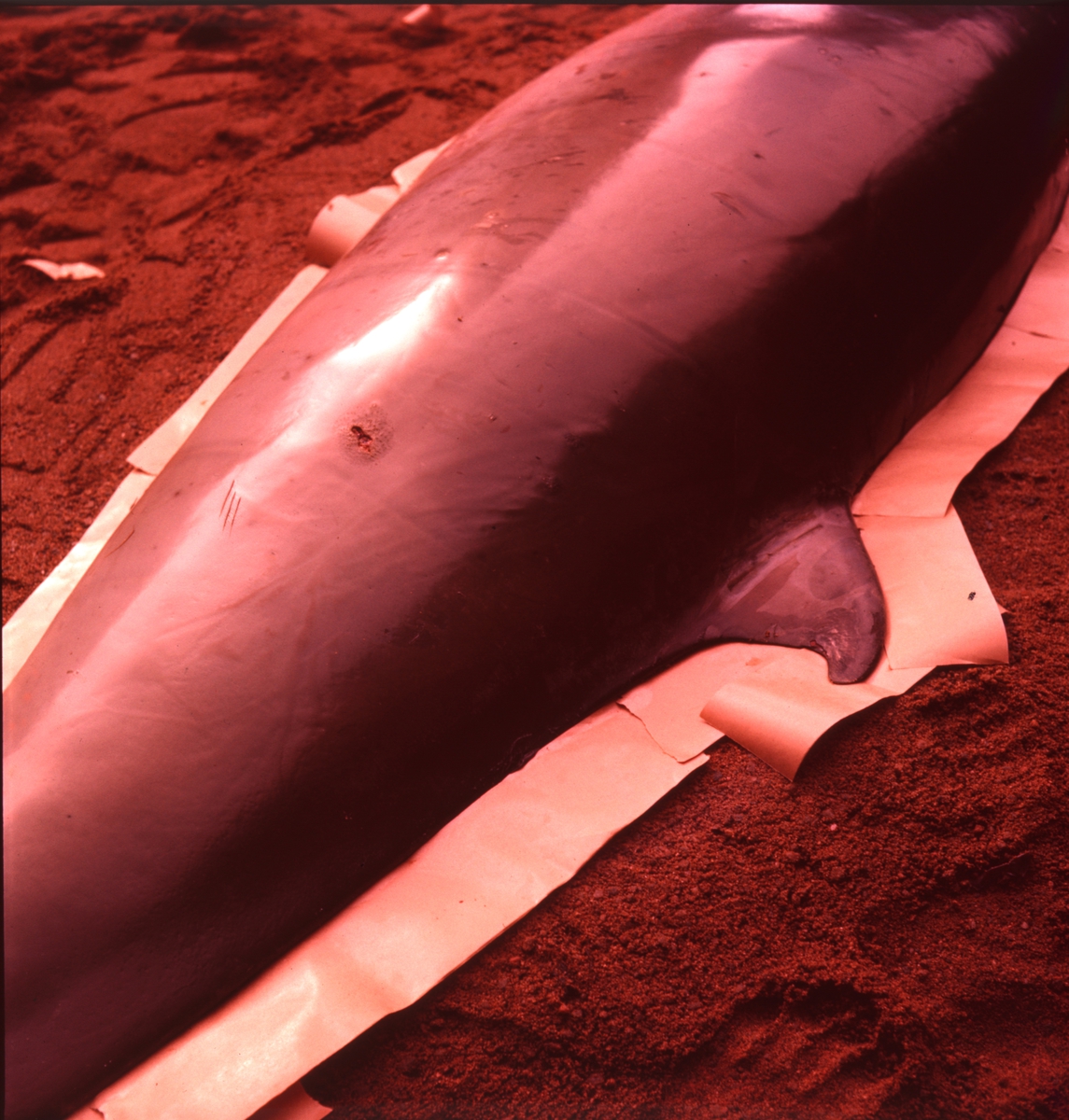 '2 näbbvalar, en gammal hona och en unge hittade, avgjutning gjord av ungen: :: :: Näbbvalen liggande på grusbädd på innergården, under arbetet med att göra avgjutningen. Närbild på del av kroppen. :: :: Ingår i serie med Fotonr. 4673:1-12.'