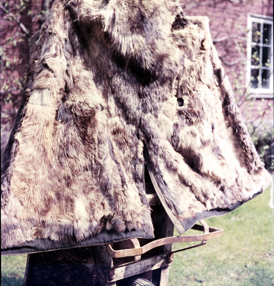 'Vargskinnspäls från Vänersborgs Museum. Skinnen av varg, icke av ''dalbohund''.Pälsen liggande på skottkärra på innergården. :: :: Se även fotonr. 4681:1.'