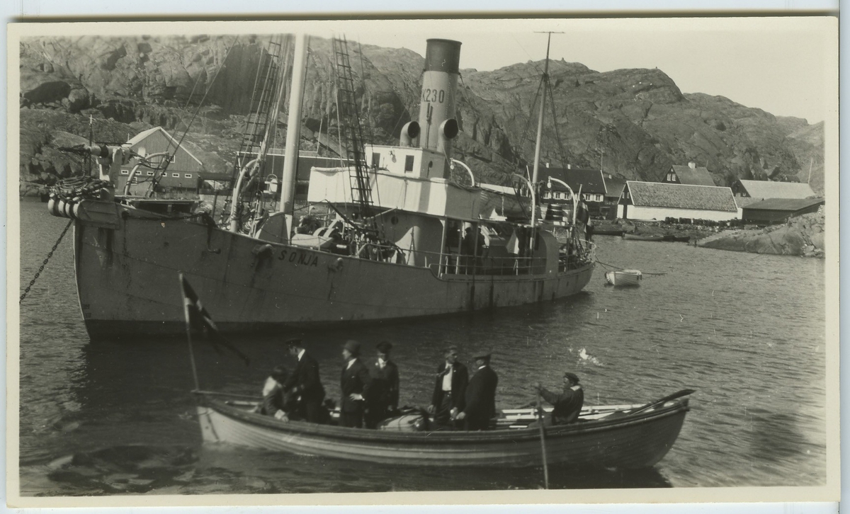 'Fartyget Sonja och en mindre roddbåt med 5 st hattklädda män stående och 2 st män som ror. På roddbåten en flagga. I bakgrunden syns berg och bebyggelse i form av knappt 10 st byggnader/hus. Kläder. Klädsel. :: I dagboken står att Frits Johansen tog fotografi på fartyget Sonja. :: :: Ingår i serie Fotonr. 5217:1-103. Se även hela fotonr. 5202-5218 med bilder från Frits Johansen.'