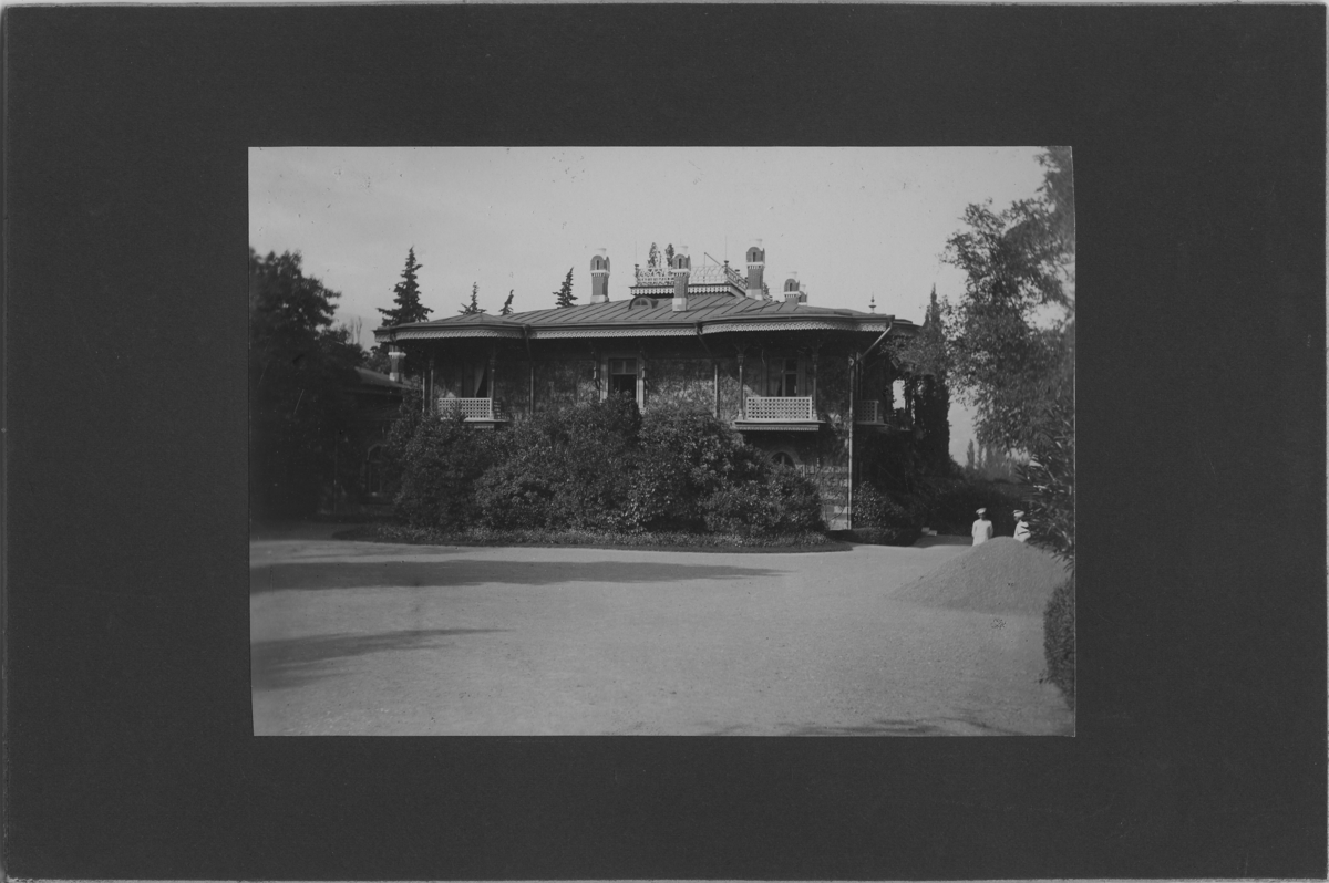 'Vy med hus med omgivande träd och buskar. 2 personer stående en bit ifrån. :: :: Se serie med fotonr. 5271:1-15. Serie fotonr 5269-5292, Stuxbergs resa till Kaukasien, 1897.'