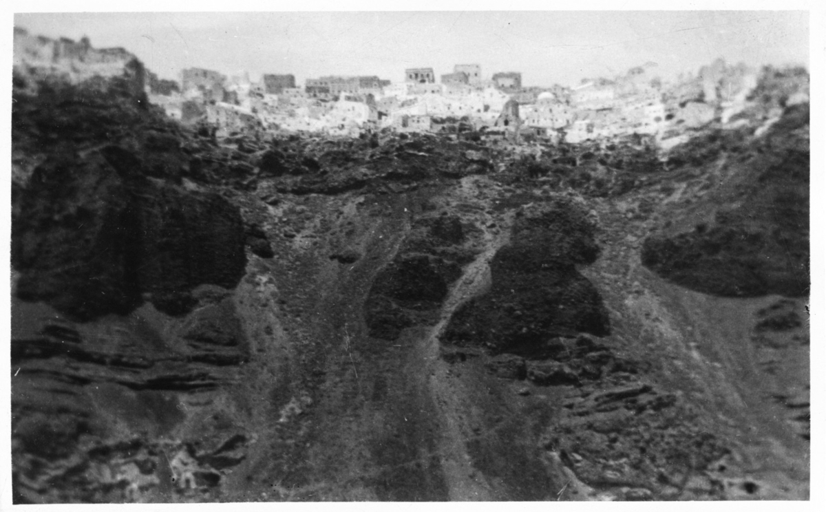'3 geologiska bilder från Grekland. :: :: Santorin, Gamla vulkankratern, fullt med små hus på kanten. :: :: Enligt anteckning på baksidan av fotografiet: ''Santorin, Byggnader uppe på den gamla kraterkanten vars sluttning synes ned mot kraterbuken, nö delen av ön.'''