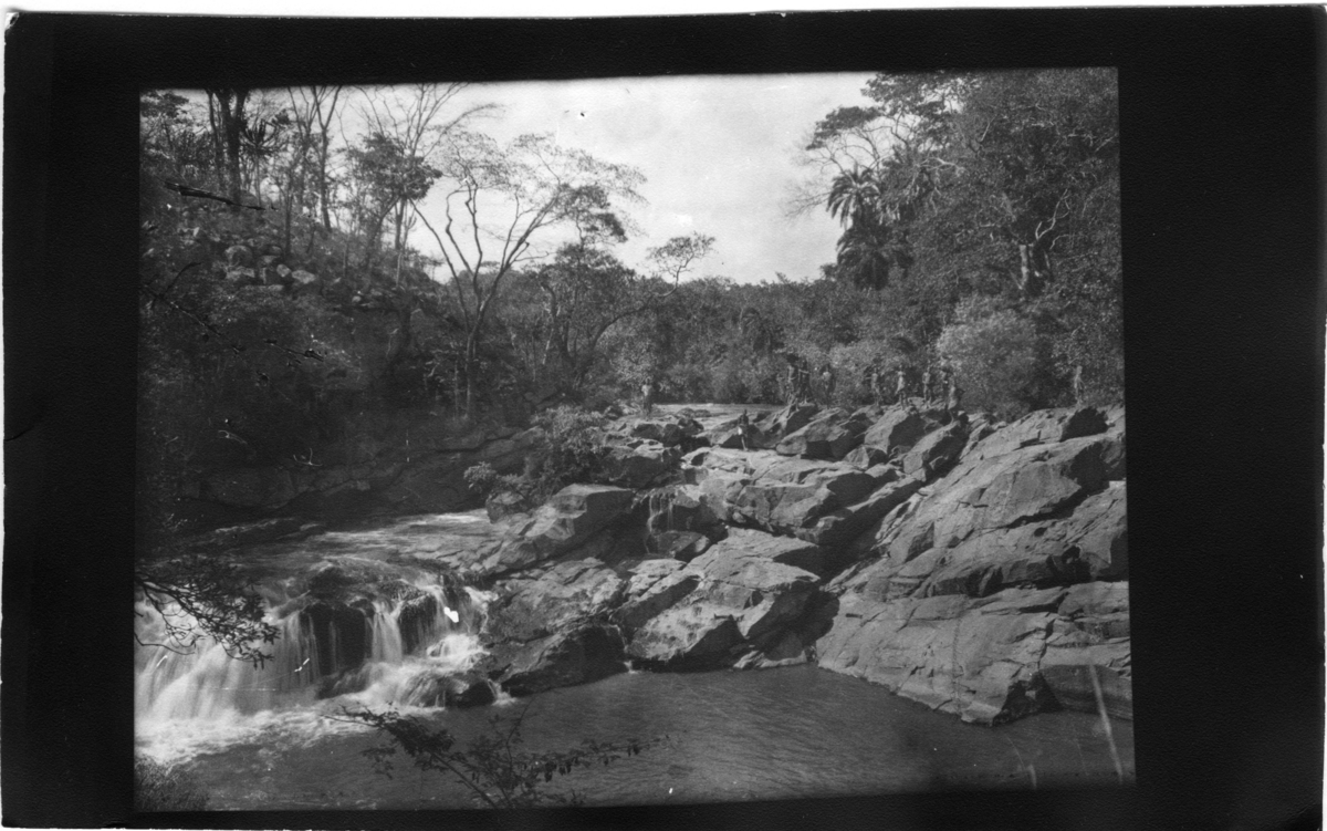 'Diverse fotografier från bl.a. dåvarande Nordrhodesia, nu Zambia, tagna av Konsul Magnus Leijer. :: :: En grupp människor fotograferade från avstånd, stående på klippavsatser bredvid en flod/vattenfall och vattensamling, omkring är skog.'