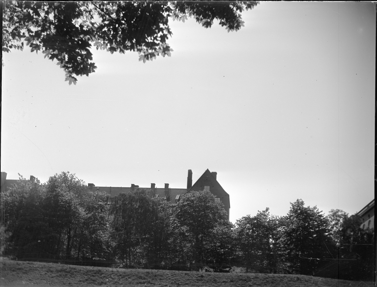 'Vy med stort tegelhus på avstånd, tak och gavel synligt bakom trädkronor. :: :: Ingår i serie med fotonr. 5236:1-11.'