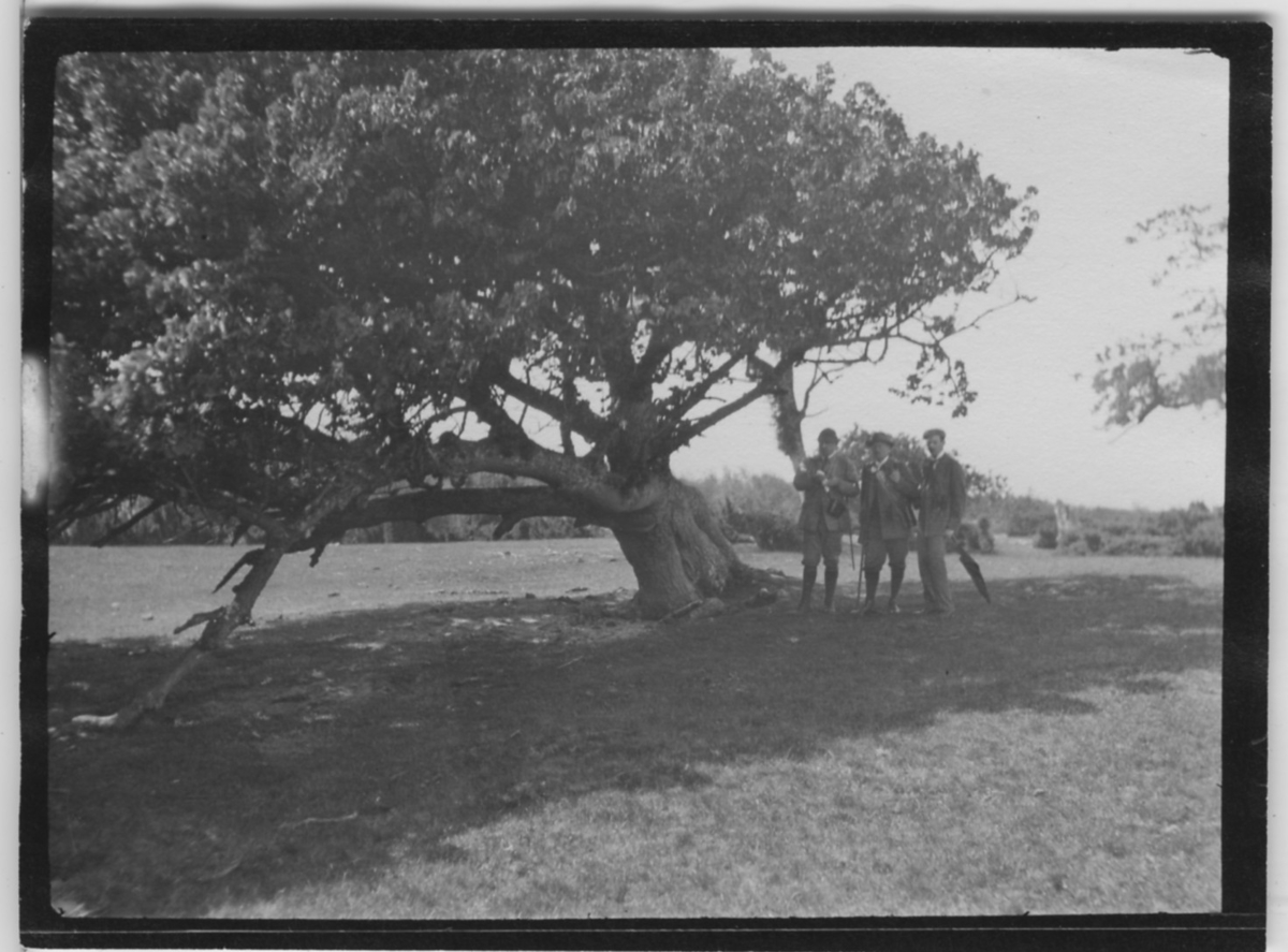 'Biologiska föreningens utfärd till Hallands Väderö: :: :: Vindpinade träd: :: :: 3 män står bredvid ett kraftigt lutande träd. Solitärt, vindpinat träd på öppen gräsmark. :: :: Se fotonr. 1464 och 4311:1-58 från samma utfärd.'