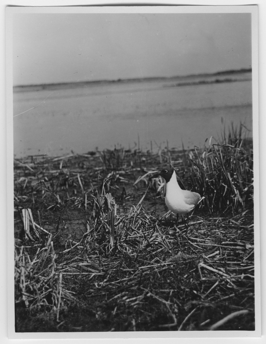'Skrattmås på strand i vass. Närbild, vy ut mot sjön. Sedd snett framifrån. Text på baksidan: Skrattmåsen har svårt för att lugna sig.'' :: :: Ingår i serie med fotonr. 2305-2346.'