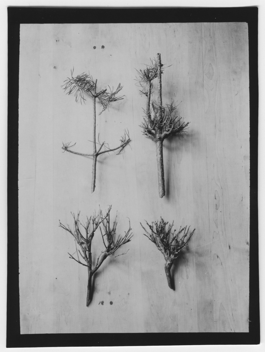 'Skador av älg (betning) på tall översta raden och björk samt ek nedersta raden. 4 prov på en skiva. :: :: Ingår i serie med fotonr. 2347-2399.'