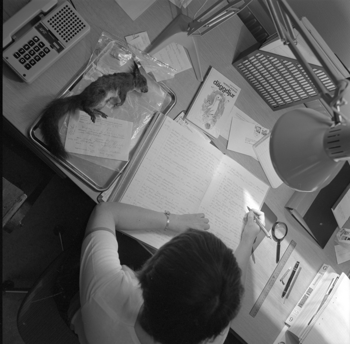 Registreringsarbete. 1 person sitter vid skrivbord med skinn av en ekorre och skriver. Med på bilden lampa och telefon.