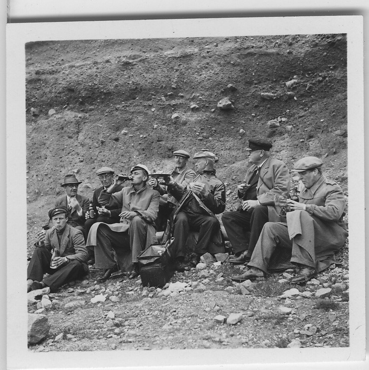 'Från ''Skageraks''-expeditionen till Hebriderna och Shetland: :: :: Gruppen sittandes på marken, 8 män, enligt anteckning på baksidan av fotografiet: ''Lunch i Hillswick''. Leonard Axel Jägerskiöld andre från höger. :: Picknick, lunch utomhus. Glasflaskor. Picknikkorg. Keps. :: :: Ingår i serie med fotonr. 4111:1-43.'