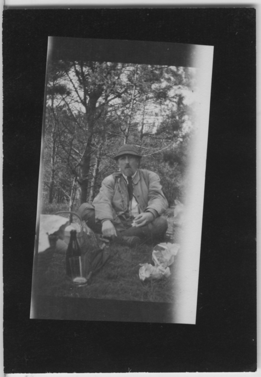 'Biologiska föreningens utfärd till Hallands Väderö: :: :: 1 man sittande vid picknickkorg med glas och glasflaska. I bakgrunden furuskog. Kläder. Klädsel. :: :: Se fotonr. 1464 och 4311:1-58 från samma utfärd.'