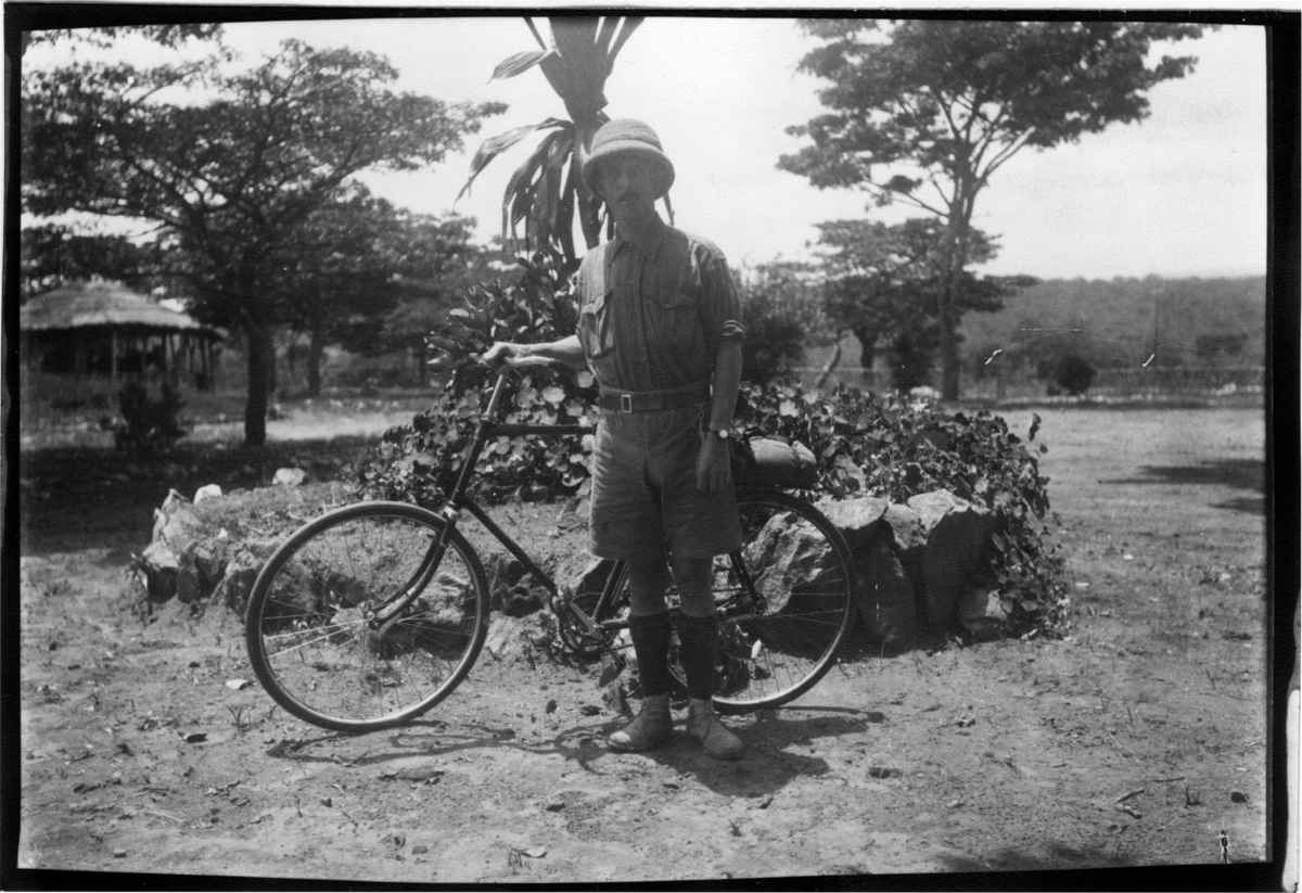 'Diverse fotografier från bl.a. dåvarande Nordrhodesia, nu Zambia, tagna av Konsul Magnus Leijer. :: :: En man ståendes med en cykel, på grusväg/plan vid en rund blomsterplantering.'