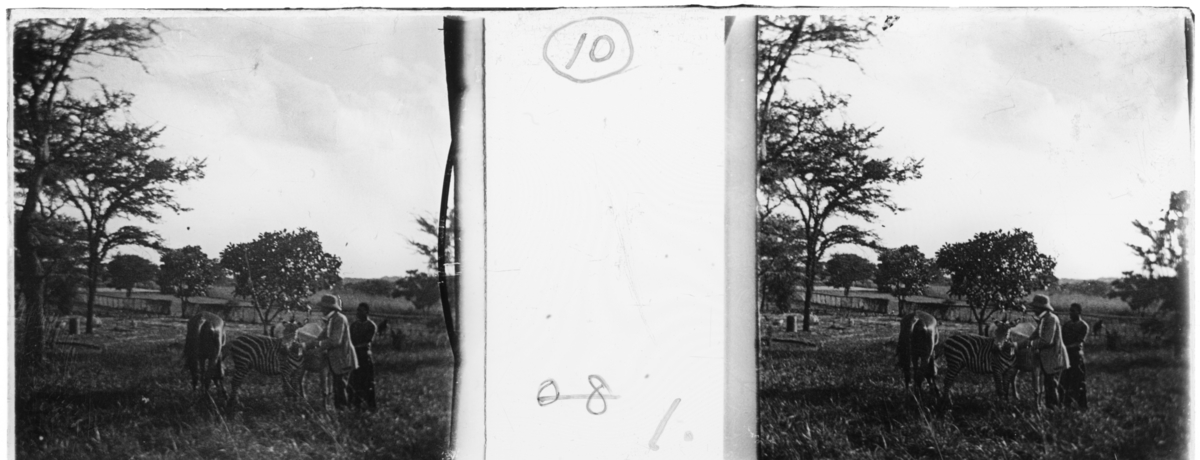 'Vy med 2 st män invid 1 sebra, åsna och häst i hage. :: Enligt text till fotot: ''Horses, donkey and zebra.'' (Hästar, åsna och zebra.) :: :: Ingår i en serie med fotonr. 5237:1-16. Se även fotonr. 5238:1-18, 5239:1-18 och 5240:1-17, 5241:1-18.'