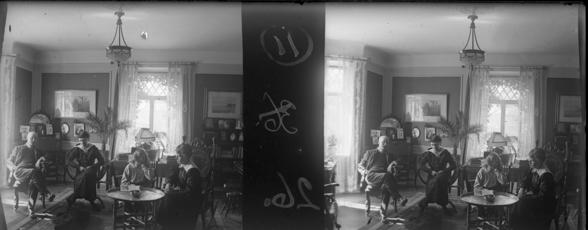 'Bildtext: ''Thelbergs, grupp.'' :: Rum där 1 man, 2 kvinnor och 1 flicka sitter på stolar centralt i rummet vid runt litet bord. Interiör med möbler, pianopall, gardiner, fönster, tavla, bordslampa, matta, skåpmöbel. :: :: Ingår i serie med fotonr. 5262:1-16. Se även hela serien med fotonr. 5237-5267.'