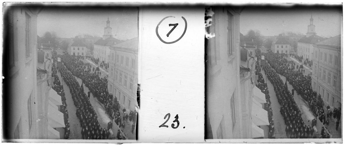 'Bildtext: ''Demonstrationståg 1 maj.'' :: Gatuvy med folkmassa, åskådare, längs gata med hus och ev. kyrka, torg. På gatan går demonstrationståg. :: :: Ingår i serie med fotonr. 5259:1-16. Se även hela serien med fotonr. 5237-5267.'