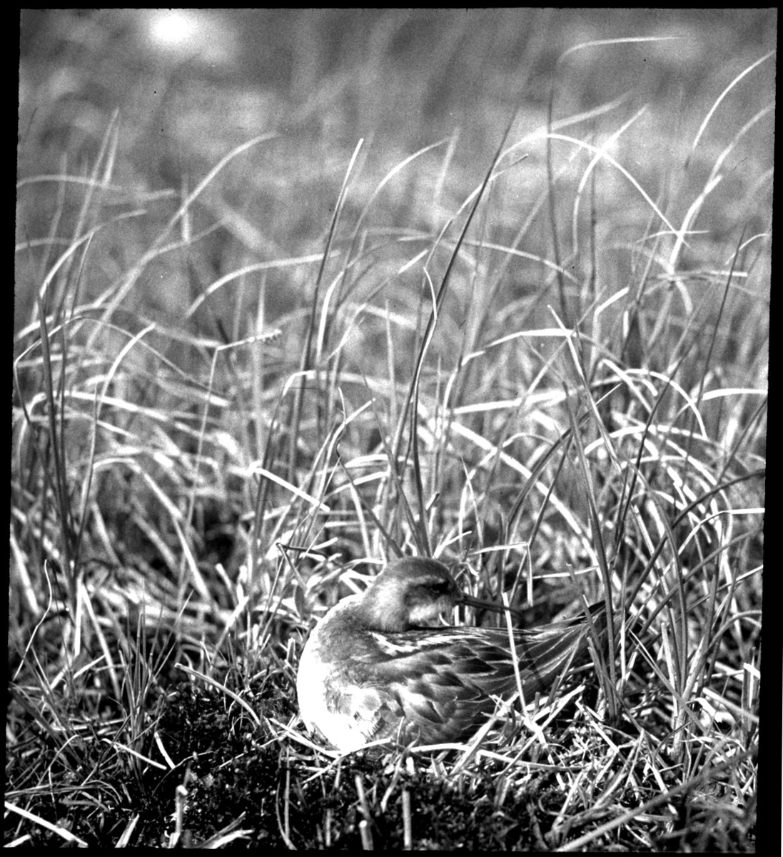 'Bildtext: ''Simsnäppa böjer strån över sig.'' Simsnäppa, liggande i hög gräsvegetation, med grässtrå i näbben. :: :: Ingår i serie med fotonr. 5161:1-9, se även hela serien fotonr. 5155-5162.'