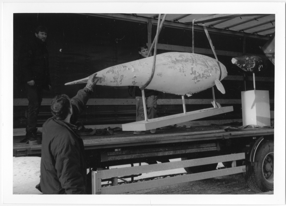 '3 män vid lastbilsflak med modeller av ev. vitval och ytterligare 1 val. Troligen i samband med ''Valutställningen''. :: Se även fotonr. 6765 med bilder från valutställningen. :: :: Ingår i serie med fotonr. 7088:1-18.'