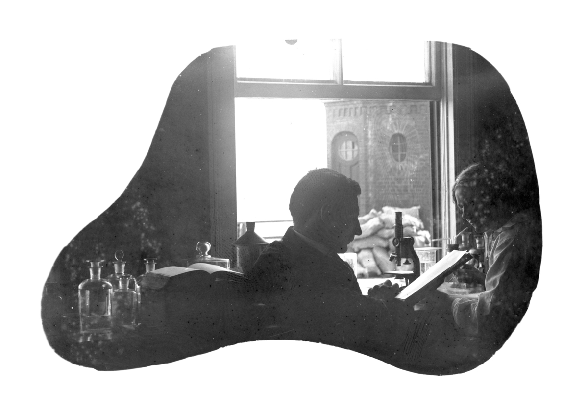 '1 kvinna och 1 man sittande vid arbetsbord. Mannen håller i en bok. På bordet mikroskop, tratt, glasflaskor och glasburkar med glaslock och kvinnan håller en pincett i handen. Sitter framför fönster. Genom fönstret syns ev. kyrktorn eller annan byggnads torn. :: :: Ingår i serie med fotonr. 5140:1-26, plåtarna ligger i en ask med texten ''Negativ, Alingsås m.m. Hesselby 1913. Marstrand. Även Helgoland. Goda kopior finnes.'''