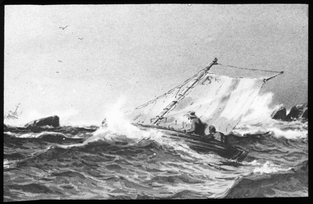 'Bildtext: ''III. 33. Lotsbåt.'' Målning av båt med 2 män ombord, hårt väder. :: :: Ingår i serie med fotonr. 5139:1-36. Fotonr. 5139:1-17 ligger i en ask med texten ''med motiv från (enligt pappasken) Helgoland. För diapositiv.'' Fotonr. 5139:18-27 ligger i en pappask med texten: ''Helgoland (''Augusta'')'' en del för diapositiv. Fotonr. 5139:28-36 ligger i en ask med texten ''Dubbletter från Helgoland. Dessutom diapositiv från Kristineberg och Lysekil.'''