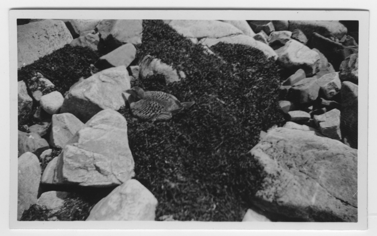 '1 st ejderhona på boet på tång. :: :: Text på baksidan av fotot: ''Ejderhonan ligger tryggt och ruvar sina ägg i tången ca 5 meter från det andra ejderboet. Fotit taget ca 1,5 meter från den ruvande honan.'' :: :: Ingår i serie med fotonr. 4500:1-172.'