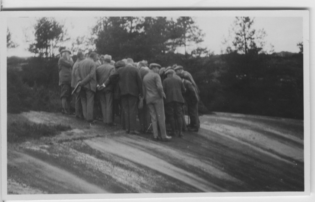 'Göteborgs Biologiska föreningens utfärd till Bullaren: :: :: Hällristningen i Tanum beses. 20-tal personer i en tät klunga på hällen. :: :: Ingår i serie med fotonr. 2088-2096.'