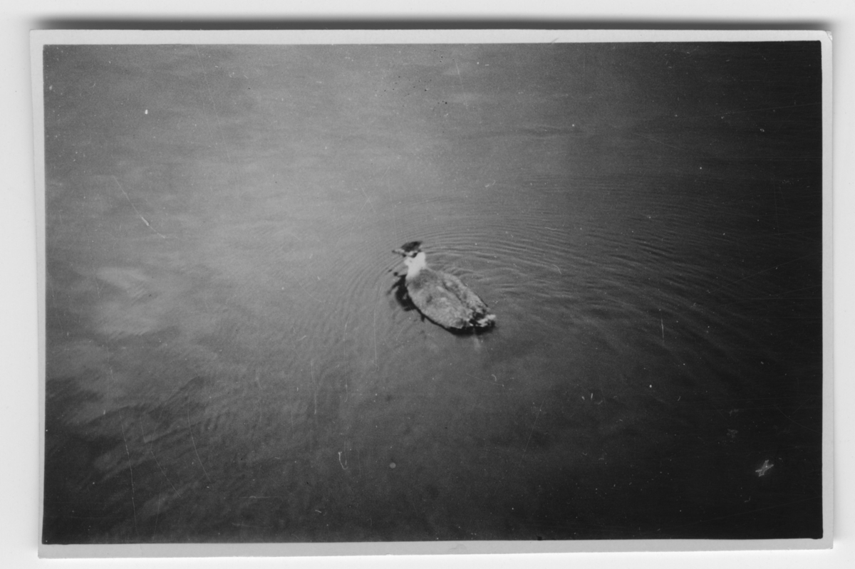 'Ringmärkt tofsvipa simmande i Kungsbackaån. Sedd snett bakifrån. :: :: Ingår i serie med fotonr. 2577-2581.'