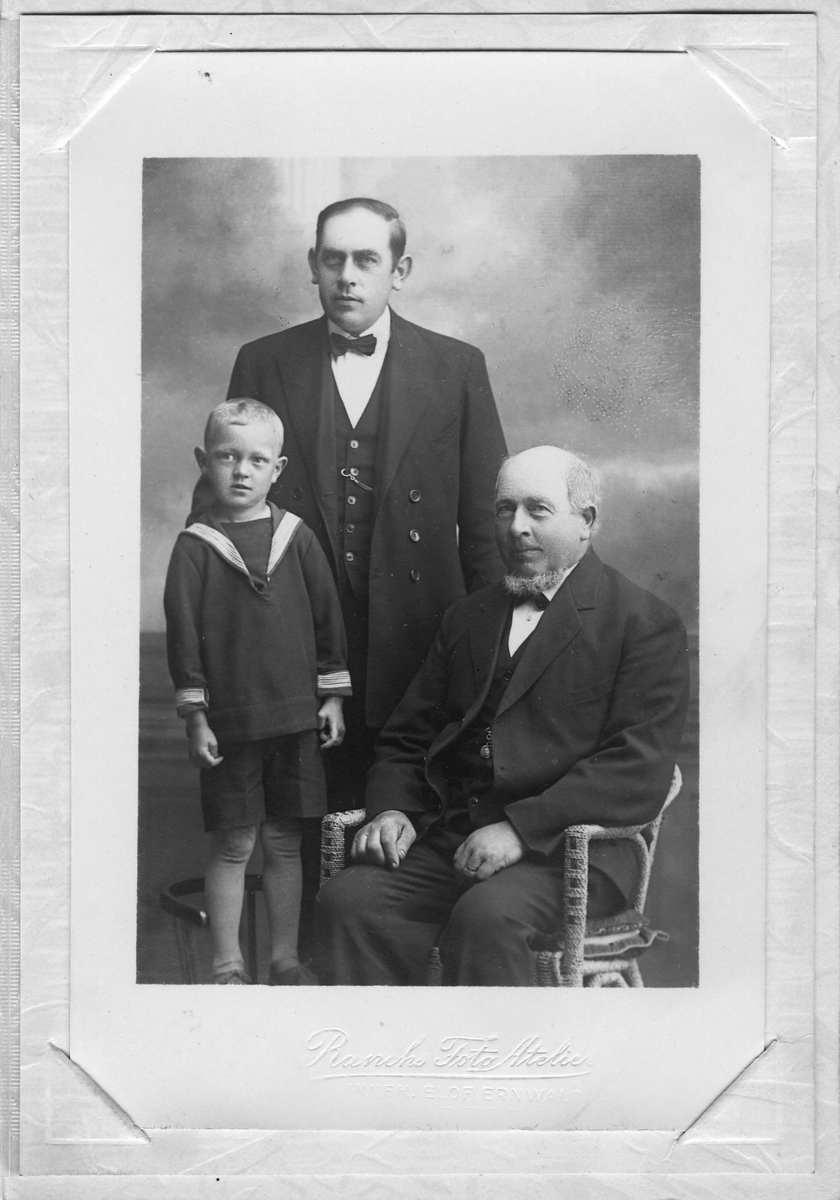 'Hamnfogden P.A. Bengtson i Träslöv. 2 män och 1 pojke :: :: Ingår i serie med fotonr. 2167-2179.'