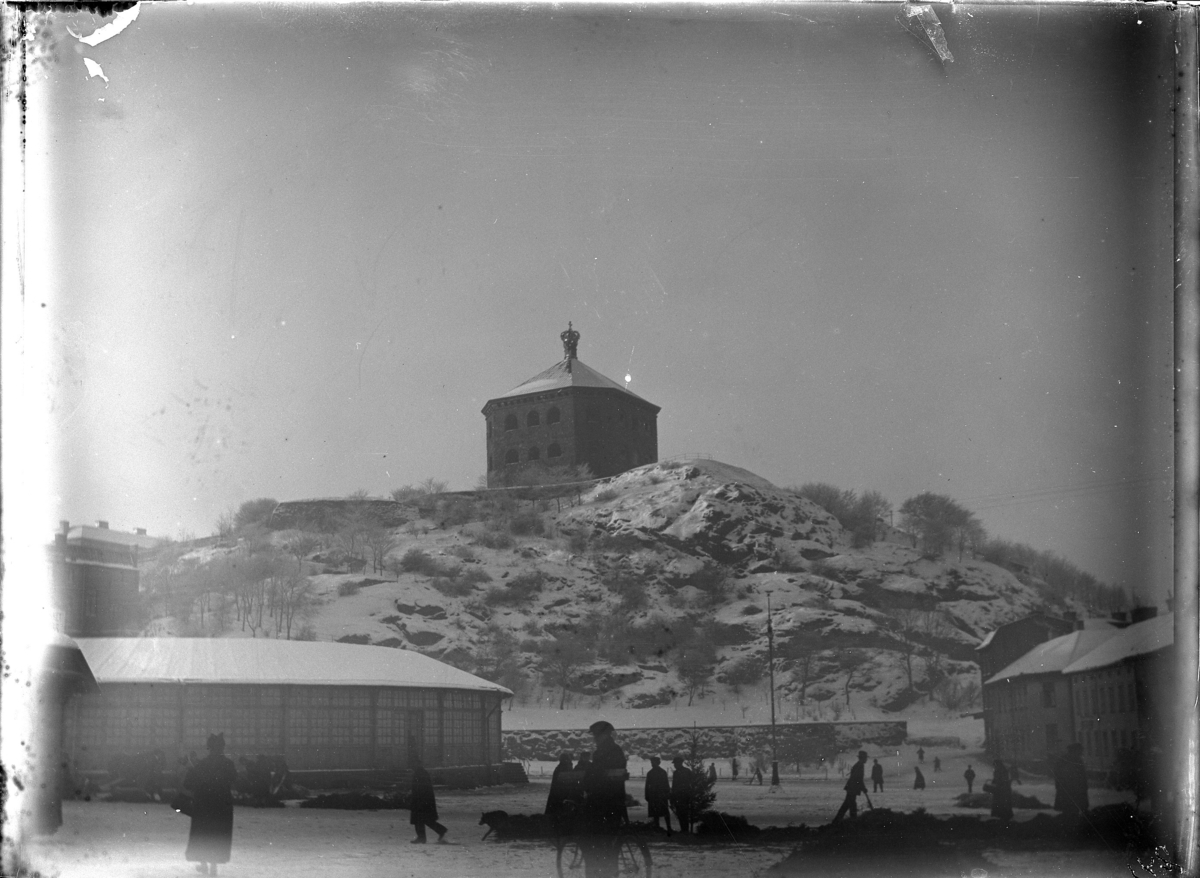 'Bildtext: ''Skansen kronan.'' :: Vy med Skansen Kronan på avstånd. I förgrunden, nedanför, på Skanstorget är människor, man med cykel och julgransförsäljning. Till vänster saluhallen. :: :: Ingår i serie med fotonr. 5228:1-11.'