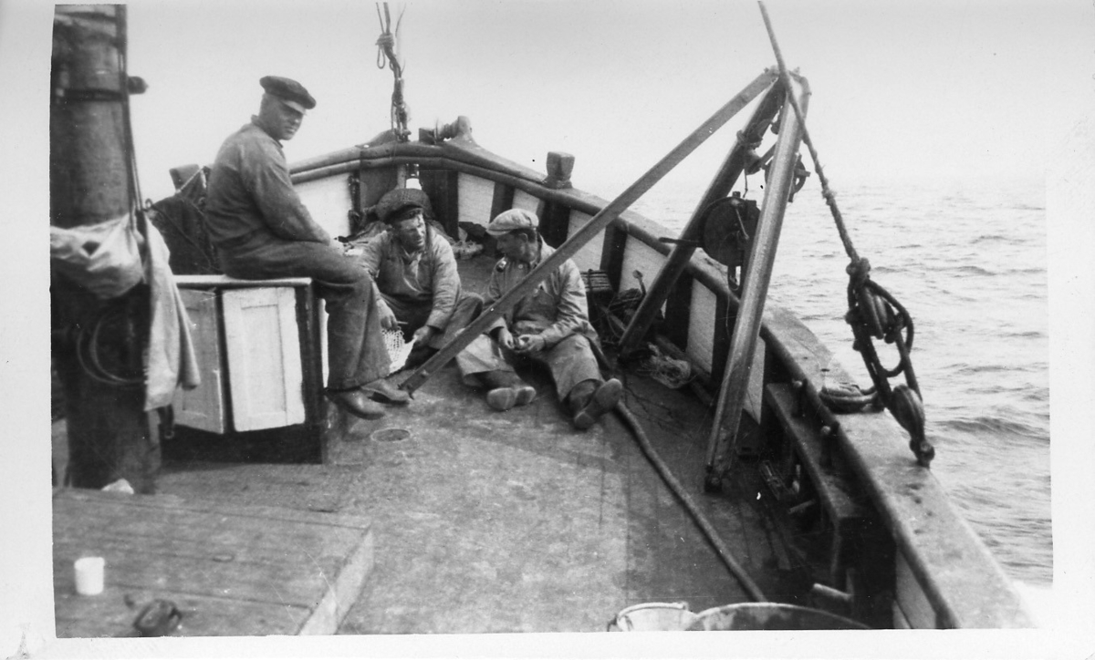 'Akka-expeditionen sommaren 1932: :: :: 3 st män på Skandias däck, Bror och Johan samt Anders Eliason. :: :: Ingår i serie med fotonr. 2400-2453.'