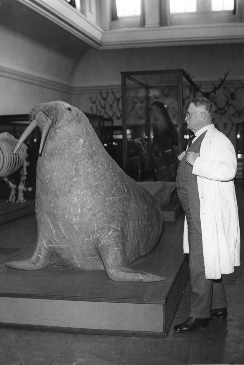 'Leonard Axel Jägerskiöld stående vid valrossen i däggdjurssalen. Till vänster syns 1 st skelett och i bakgrunden vägg med diverse uppsatta horn. :: :: Se även fotonr. 3037. :: :: Färdigt montage finns i Valsalen på Göteborgs Naturhistoriska museum (2007-06-18).'