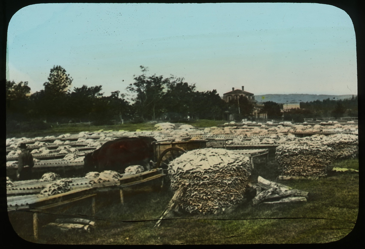 'Torknig av torsk och travad torkad fisk. Anteckning på glaset: ''Codfish drying.'' I bakgrunden hus. :: :: Ingår i serie med fotonr. 5202:1-10 med färgdia från Nova Scotia. Se även hela fotonr. 5202-5218 med bilder från Frits Johansen.'