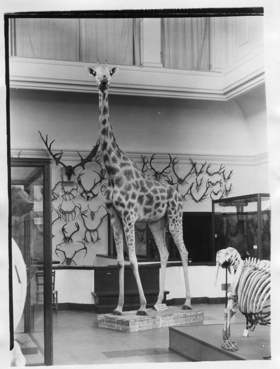 Den monterade giraffen i däggdjurssalen stående ovanför trappan. I bakgrunden vägg med horn uppsatta. Valrosskelett till höger, björnhuvud till vänster. Glasmonter. Stol.