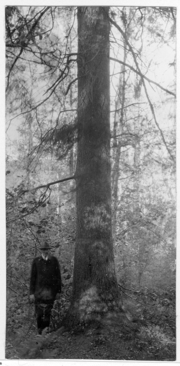 'Bildtext: ''Bild 142. Spontan gammal gran, 74 cm i diameter, vid brösthöjd.'' 1 man stående intill grov granstam. :: :: Fotonr. 7046:119-185 indelade som ''Märkvärdiga träd i Göteborgs län och Bohus län''. Ingår i serie med fotonr. 7046:1-383, 7047:1-33 och 7048:1-67 med bilder från Länsjägmästare John Lindners bildarkiv.'