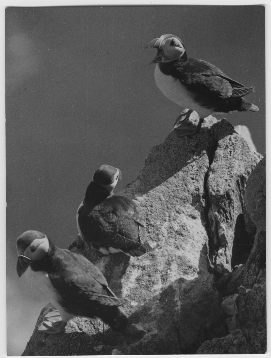 'Lunnefåglar, närbild på 3 fåglar på en klippa. :: :: Ingår i serie med fotonr. 3382-3407.'