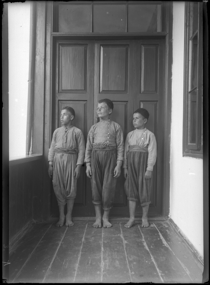 '3 pojkar stående framför vägg. Kläder. Klädsel. :: :: Ingår i serie med fotonr. 5276:1-20. Se även fotonr. 5269-5292 med bilder från Stuxbergs resa till Kaukasien.'