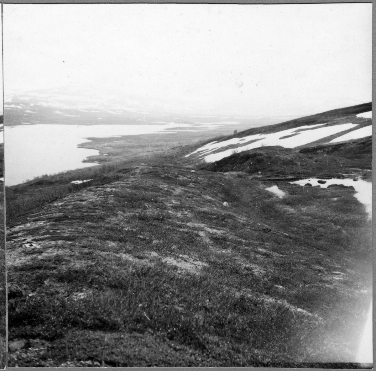 'Bildtext: ''Israndläge på Krappesvares nordsluttning.'' Vy med snö liggande på bergsluttning ner mot fjord. :: :: Ingår i serie med fotonr. 7052:1-19 med bilder bl.a. från Surteskredet.'