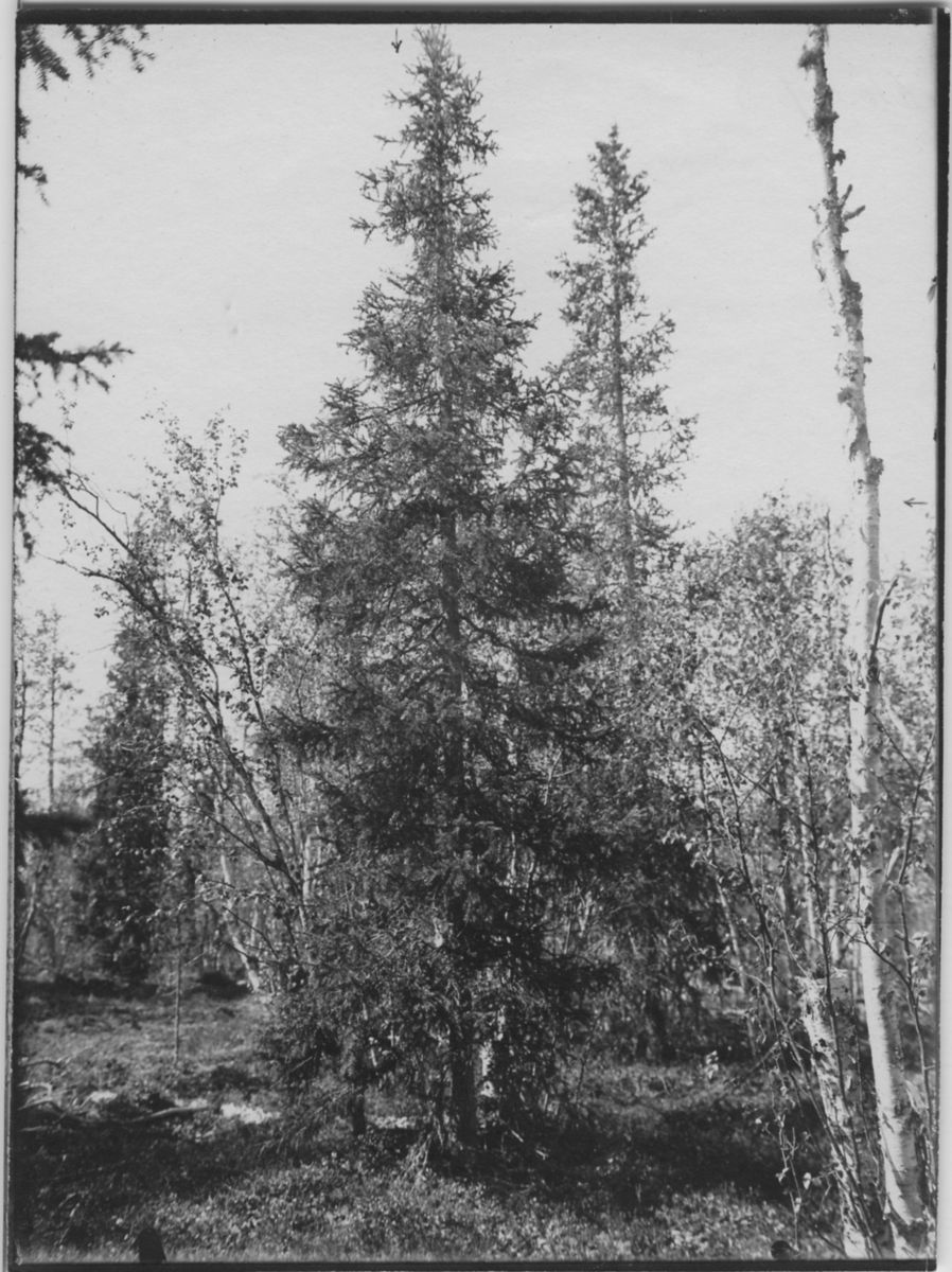 'Boplatsen för sidensvans. En liten pil i högra kanten visar antagligen platsen för boet. Vy med granar och lövträd. :: :: Ingår i serie med fotonr. 156-158.'