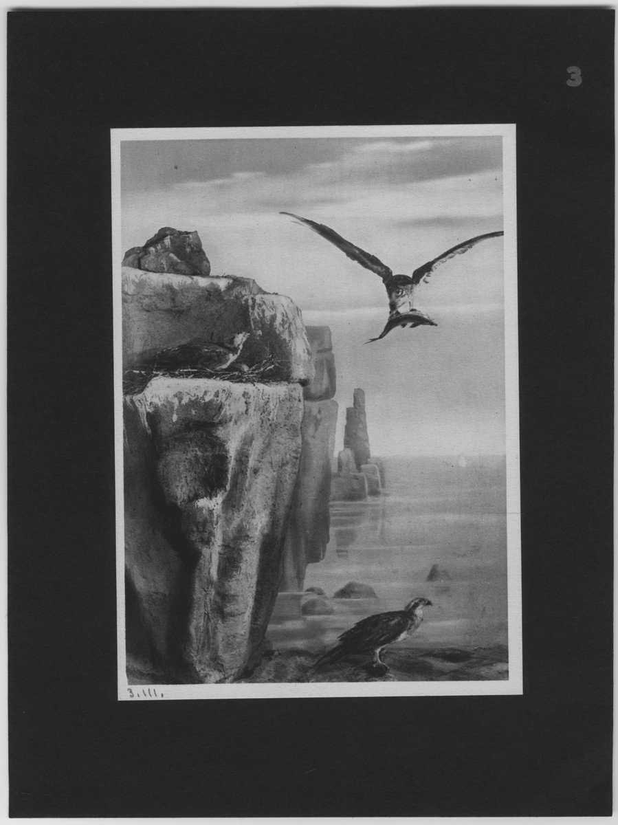 'Fiskgjusar, en fågel i luften med fisk i klorna. :: :: Bilderna är numrerade 1-6 och det finns ett tillhörande häfte med en text till varje bild: Orr- och Tjädertuppar, Grå häger, Fiskgjuse, Strandfåglar, Mårddjur och Vildsvin. :: :: Ingår i en serie fotonr. 3096-3108 med 12 st fotografier av dioramorna i Zoologiska museet i Berlin och fotonr. 3109-3120 med 12 st fotografier av dioramorna i Hermann-Roemer-museet, Hildesheim.'