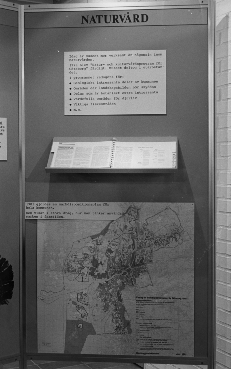 'Foto på Jubileumsutställningen, Göteborgs Naturhistoriska museum 150 år. :: :: Utställningsskärm angående muséets engagemang inom naturvård i Göteborg 1983. Med bl.a. markdispositionsplan för göteborgs kommun.'