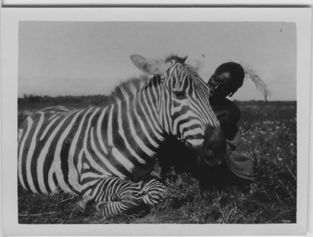 'Zebra, skjuten. 1 person sittande intill, håller upp huvudet. I bakgrunden öppen gräsmark. :: :: Serie fotonr 1434-1449'