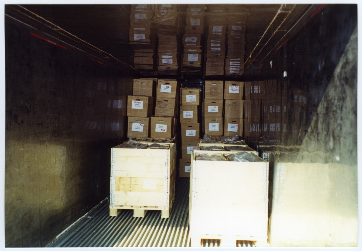 'Bildtext: ''Containerinnehåll med material från Gamla Lödöse på Gårda.'' Vy in i container med staplade papplådor och stora trälådor. :: :: Ingår i serie med fotonr. 7049:1-15 ''Fotodokumentation av mögelsanering och av lokaler i källaren.'''