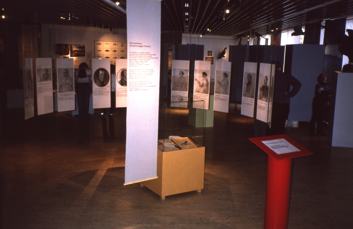 'Motiv av utställningen om konstnärsbröderna von Wright på Göteborgs Naturhistoriska museum: :: :: Hängande utställningsskärmar och utställningsmontrar. :: :: Ingår i serie med fotonr. 6938:1-35.'