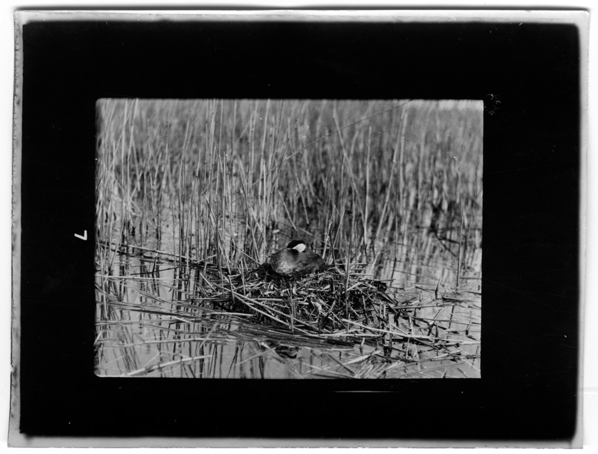 'Gråhakedopping sovande på boet i vatten. :: :: Ingår i serie med fotonr. 1661-1689.'