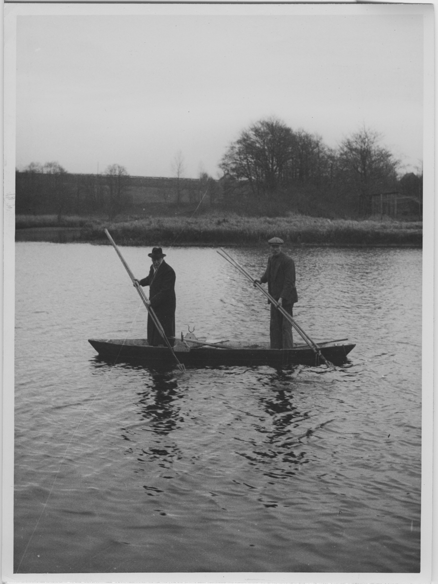 'Vy med 2 män stående i eka, med strandkant i bakgrunden. Männen sedda framifrån. Enligt bildtext: Pärlfiske i Lagan: med de långa tängerna känner man efter musslor på bottnen. :: :: Ingår i serie med fotonr. 3744-3750. Samma motiv som 3746:1.'