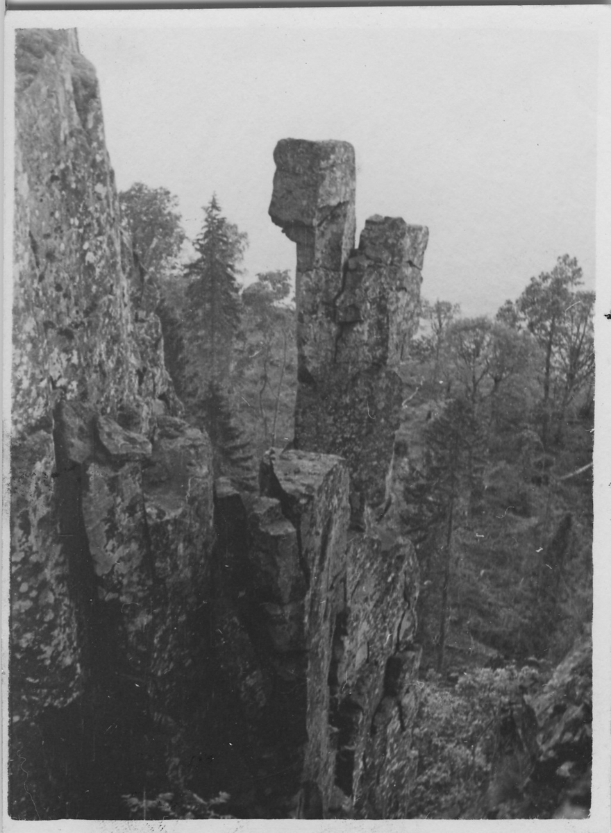 'Biologiska föreningens utfärd till Halleberg och Dättern. :: :: Vy över starkt förklyftad diabas, med skog i bakgrunden.'