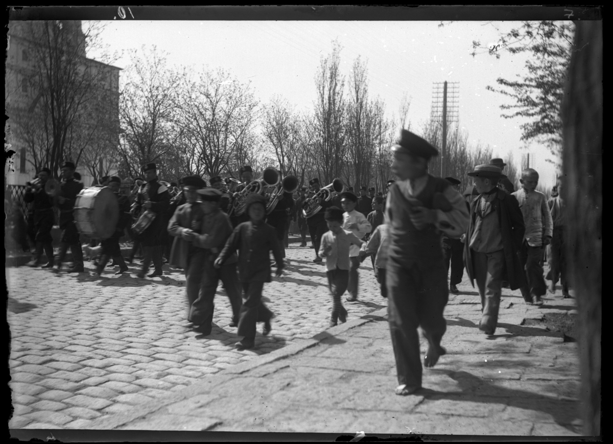 'Gatuvy med människor, män, barn gående på kullerstensgata. På gatan går en musikkår med blåsinstrument och slaginstrument. Kläder. Klädsel. Uniform. :: :: Ingår i serie med fotonr. 5285:1-11. Se även fotonr. 5269-5292 med bilder från Stuxbergs resa till Kaukasien.'
