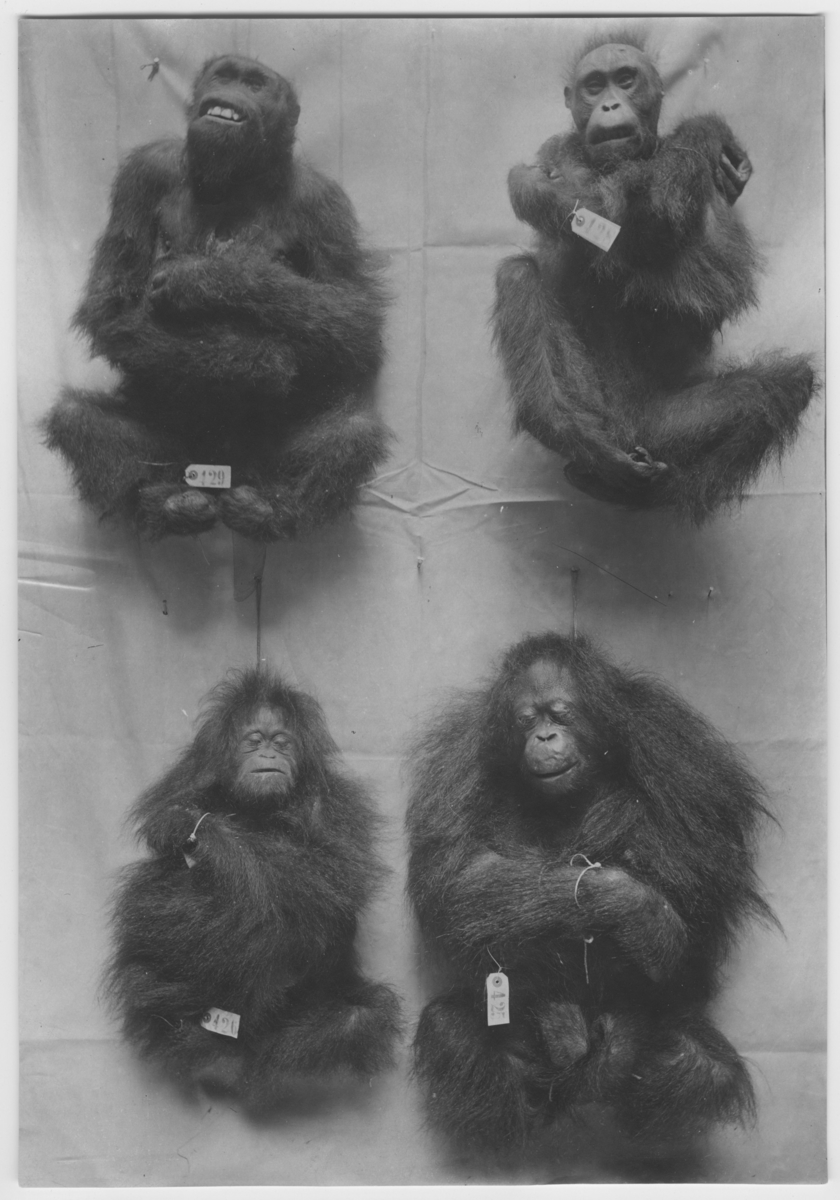 '4 primater upphängda på en vägg. Numrerade nr 129, 128, 420 samt 425. :: På baksidan står Lager Kühlhaus 1914. :: :: Ingår i serie med fotonr. 1975-1997.'