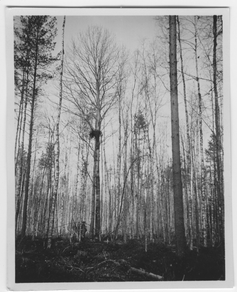 'Bo av duvhök i björk. Vy med björkar och tallar kring boträdet. :: :: Stämpel på baksidan ''Nyblin 1985''.'