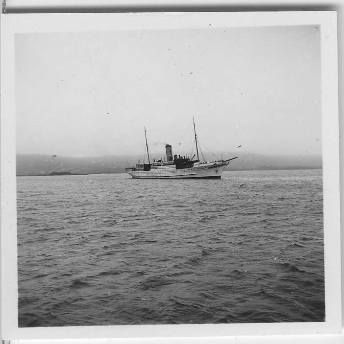 'Från ''Skageraks''-expeditionen till Hebriderna och Shetland: :: :: En båt till havs, fotograferad på avstånd. Enligt anteckning på baksidan av fotografiet: ''S:t Sunniva Lerwick''. :: :: Ingår i serie med fotonr. 4111:1-43.'