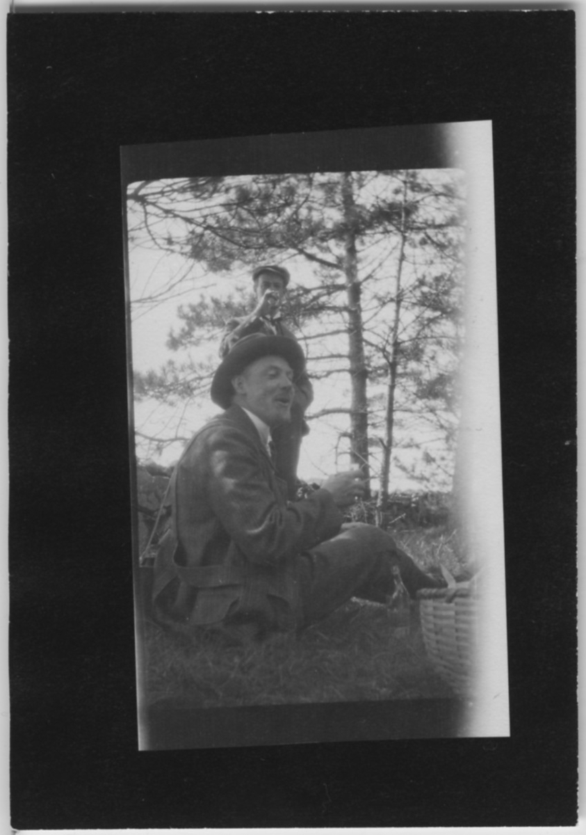 'Biologiska föreningens utfärd till Hallands Väderö: :: :: En man sitter bredvid en flätad korg och en annan man står upp och dricker. :: :: Se fotonr. 1464 och 4311:1-58 från samma utfärd.'