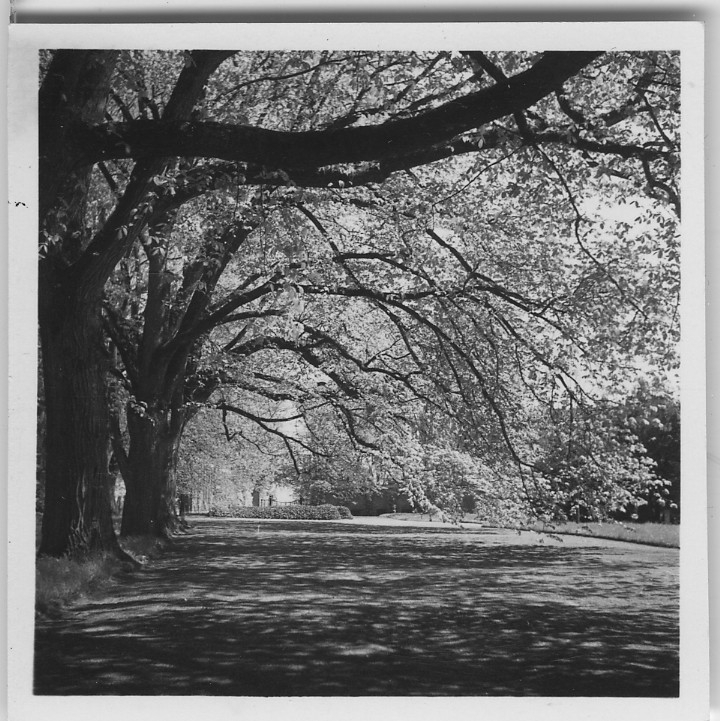'Från Biologiska Föreningens utfärd till bl.a. Ivö i nordöstra Skåne: :: :: Vy över grusväg gräsmatta och träd, framförallt grenverket, från Bäckaskogs park. :: :: Se fotonr. 4119:1-11 och 4120:1-10 från samma utfärd. Fotonr.'