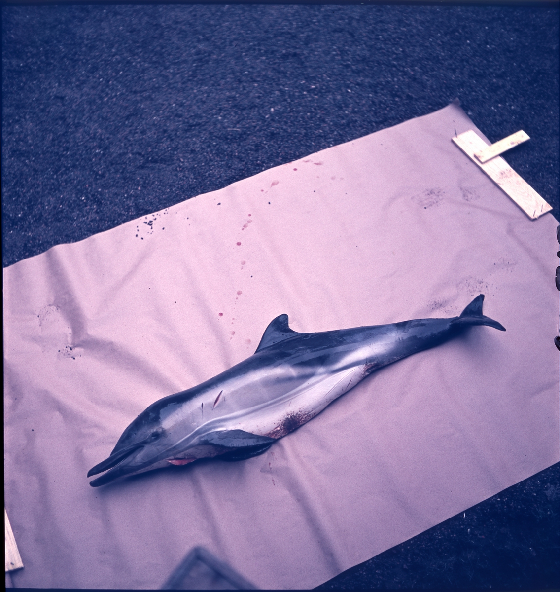 'Delfin liggande på papper på marken. Fynddatum 1957-02-17. :: :: Ingår i serie med fotonr. 4675:1-3.'